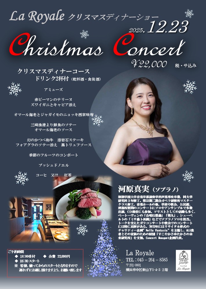 和牛ステーキをご堪能いただき、食後は一流のエンターテインメントでおくる至高の饗宴。ソプラノ歌手河原真美さんによるクリスマスディナーショーで